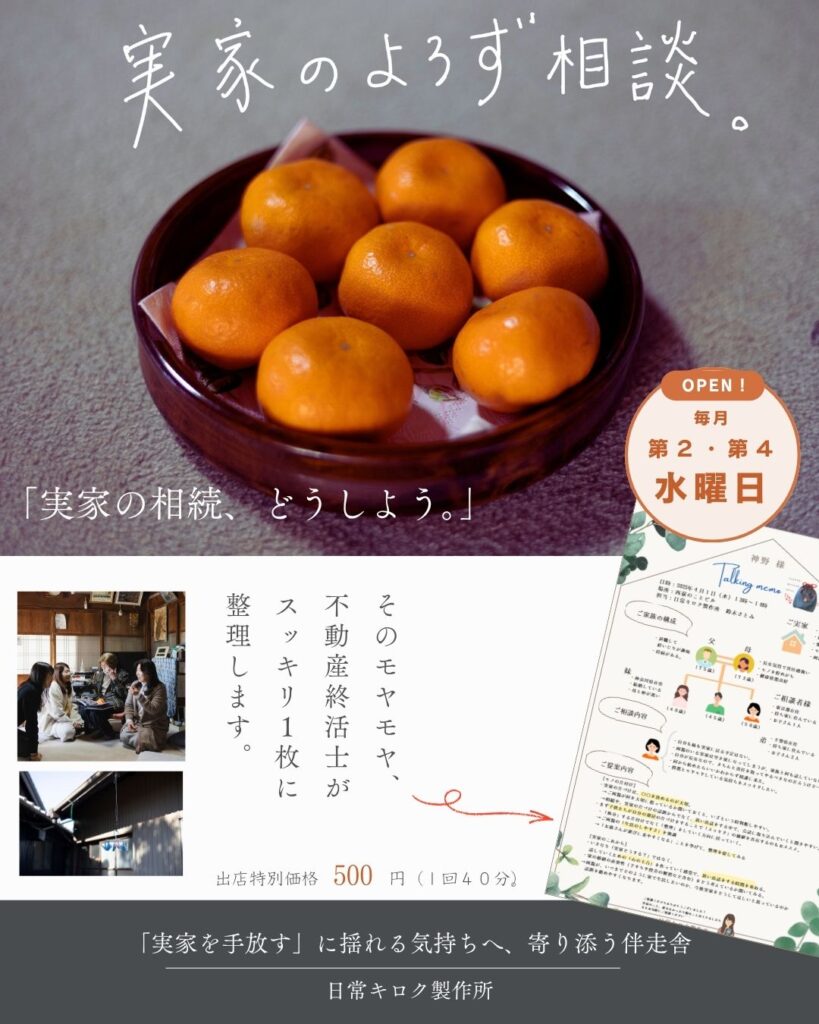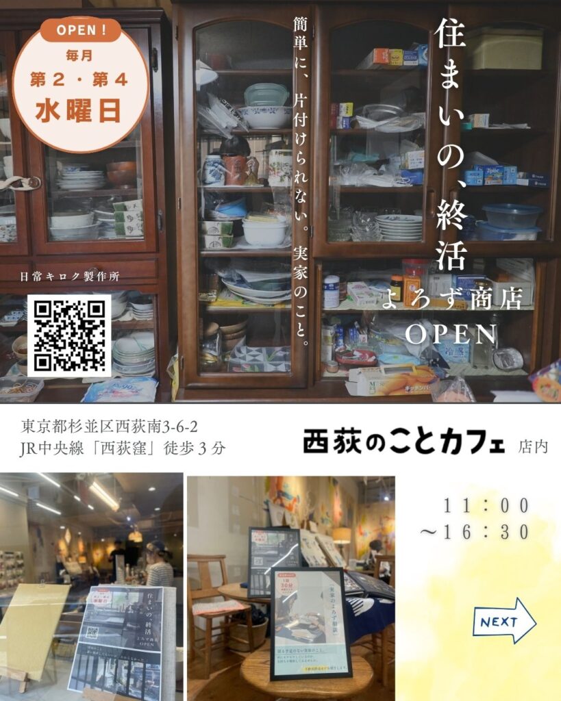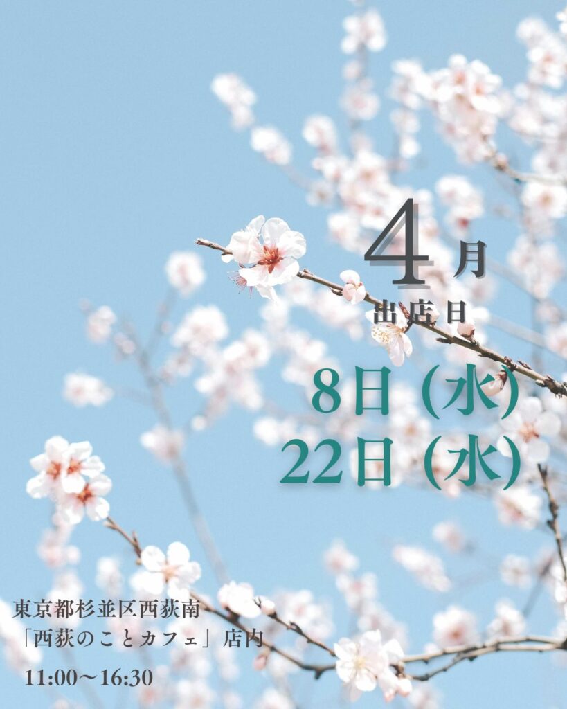4月の出店日(西荻のことカフェ) 2026年3月23日 最終更新日時 : 2026年3月23日 suzuki こんにちは、日常キロク製作所です。 毎月第2・4水曜日に「実家の終活」「家じまい」をテーマに、 月2回、杉並区のコミュニティカフェ「西荻のことカフェ」にて、 定期間借り出店をしております。 4月の出店日は、第2水曜日の4月8日、第4水曜日の4月22日となります。 📒詳細はコチラをご参照ください→ 出店メニュー 店内はカフェになっており、気負わずに来店できる雰囲気です。 お気軽にお越しください。