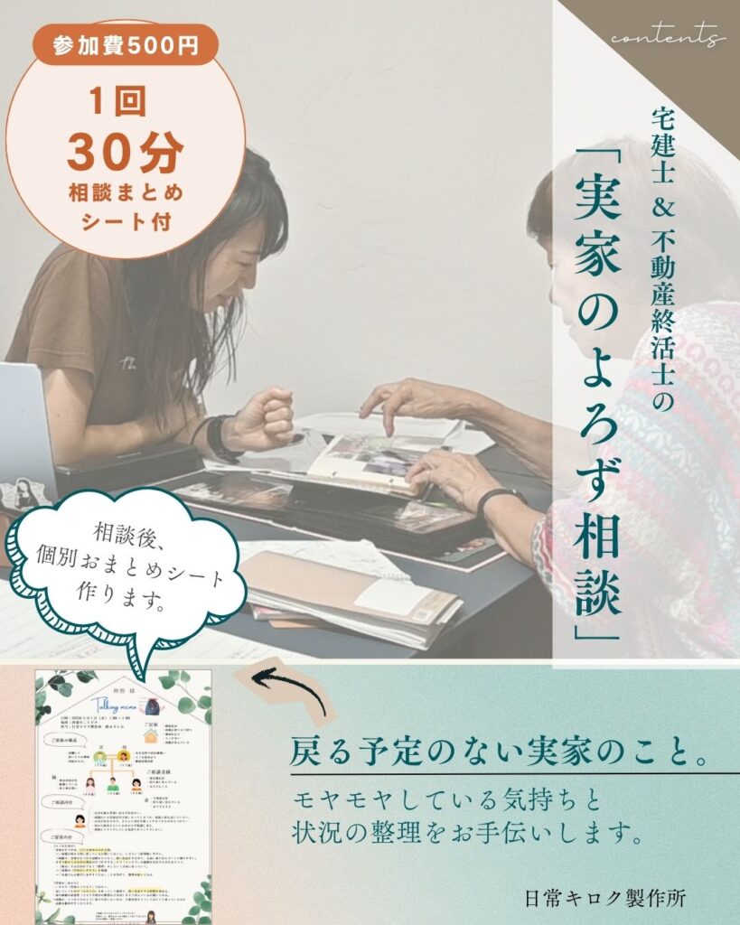 1月の出店日(西荻のことカフェ) 2025年12月24日 最終更新日時 : 2025年12月24日 suzuki こんにちは、日常キロク製作所です。 毎月第2・4水曜日に「実家の終活」「家じまい」をテーマに、 月2回、定期間借り出店をしております。 年明け、1月の出店日1月14日(水)、1月28日(水)の2回です。 📒詳細はコチラをご参照ください→ 出店メニュー 住まいの終活よろず相談、我が家の思い出をまとめるお手伝いなど、 500円ワンコインメニューをご用意しております。 店内はカフェになっており、気負わずに来店できる雰囲気です。 お気軽にお越しください